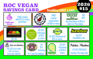 As always, the Roc Vegan Savings Card, like Rochester VegFest, is a joint project of the nonprofits ARRoc and RAVS, to benefit Rochester VegFest and other local vegan projects. Thank you for your support!