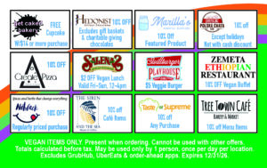 For vegan items only. Present when ordering. Cannot be used with other offers. Totals calculated before tax. May be used only by one person, once per day per location. Excludes GrubHub, UberEats & order ahead apps. Expires 12/31/26.