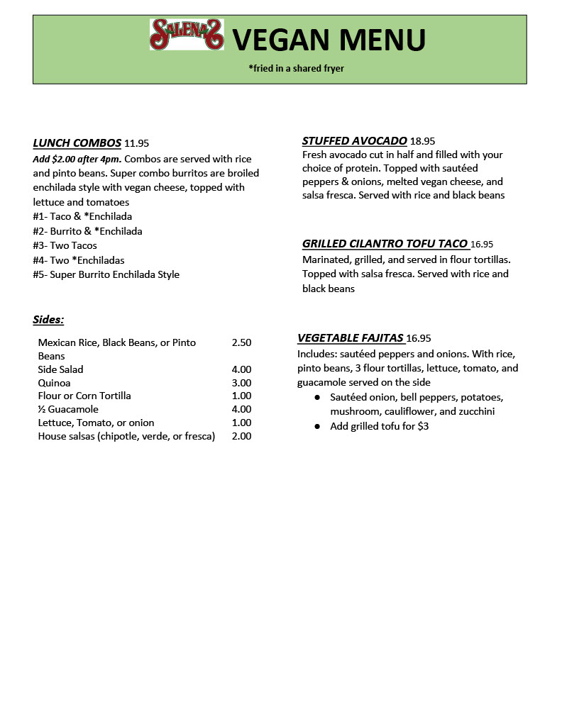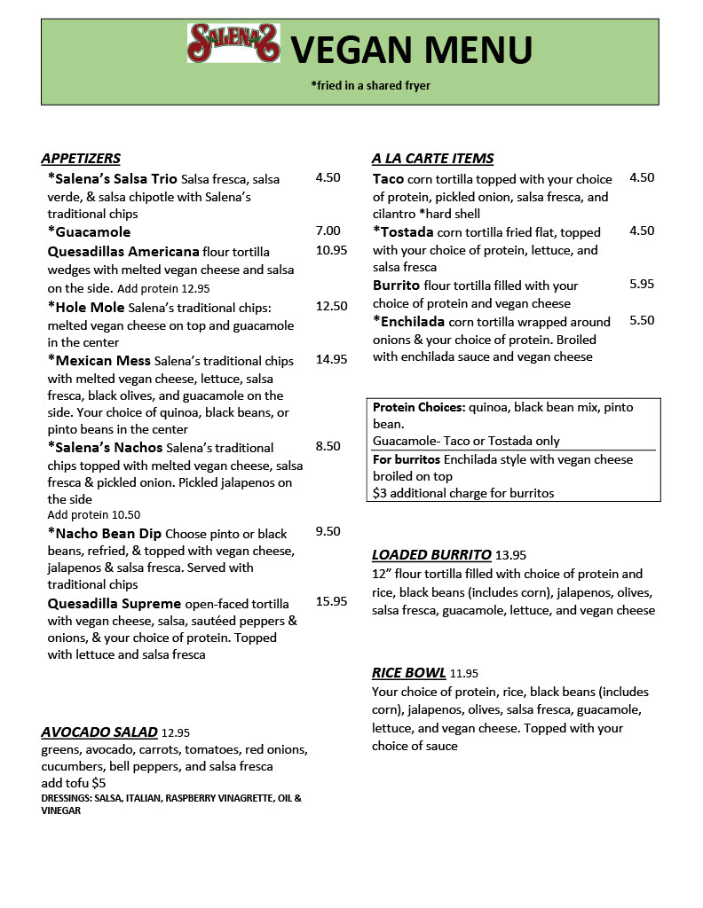 Salena’s Mexican Restaurant Posted on July 23, 2021 by RocVegFest_Admin Salena’s Mexican Restaurant has a vegan menu! Share this: Click to share on Facebook (Opens in new window) Facebook Click to share on X (Opens in new window) X